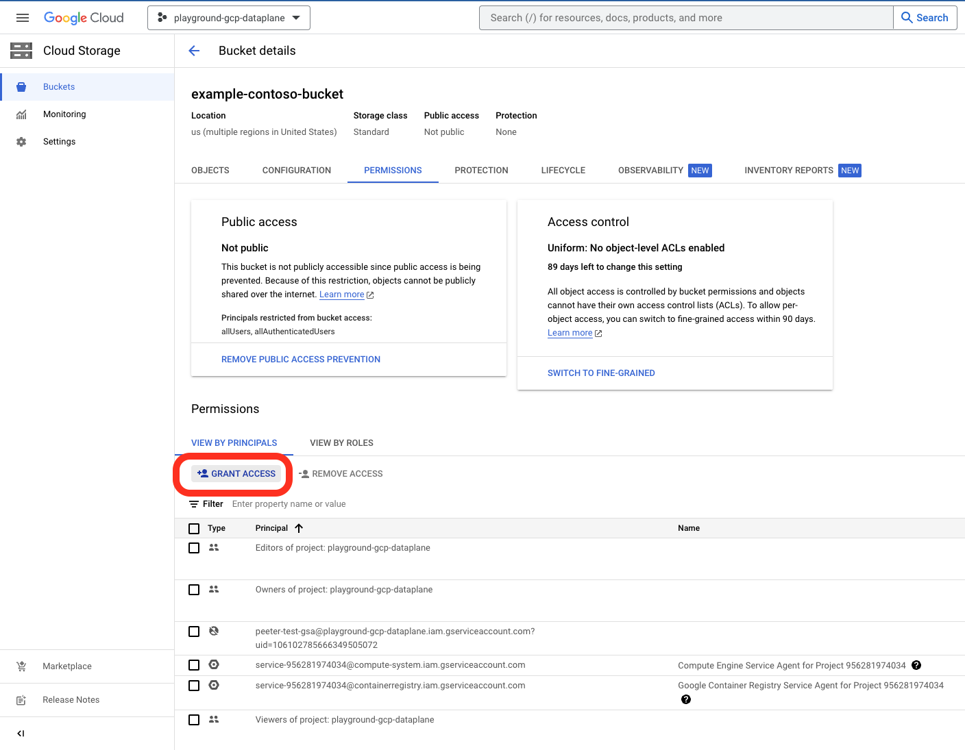 <UserFlyteGSA>in your Union.ai data plane GCP project (See Find the actual name of<UserFlyteGSA>) - Go to Cloud Storage > Buckets and select the bucket to which you want to grant access.