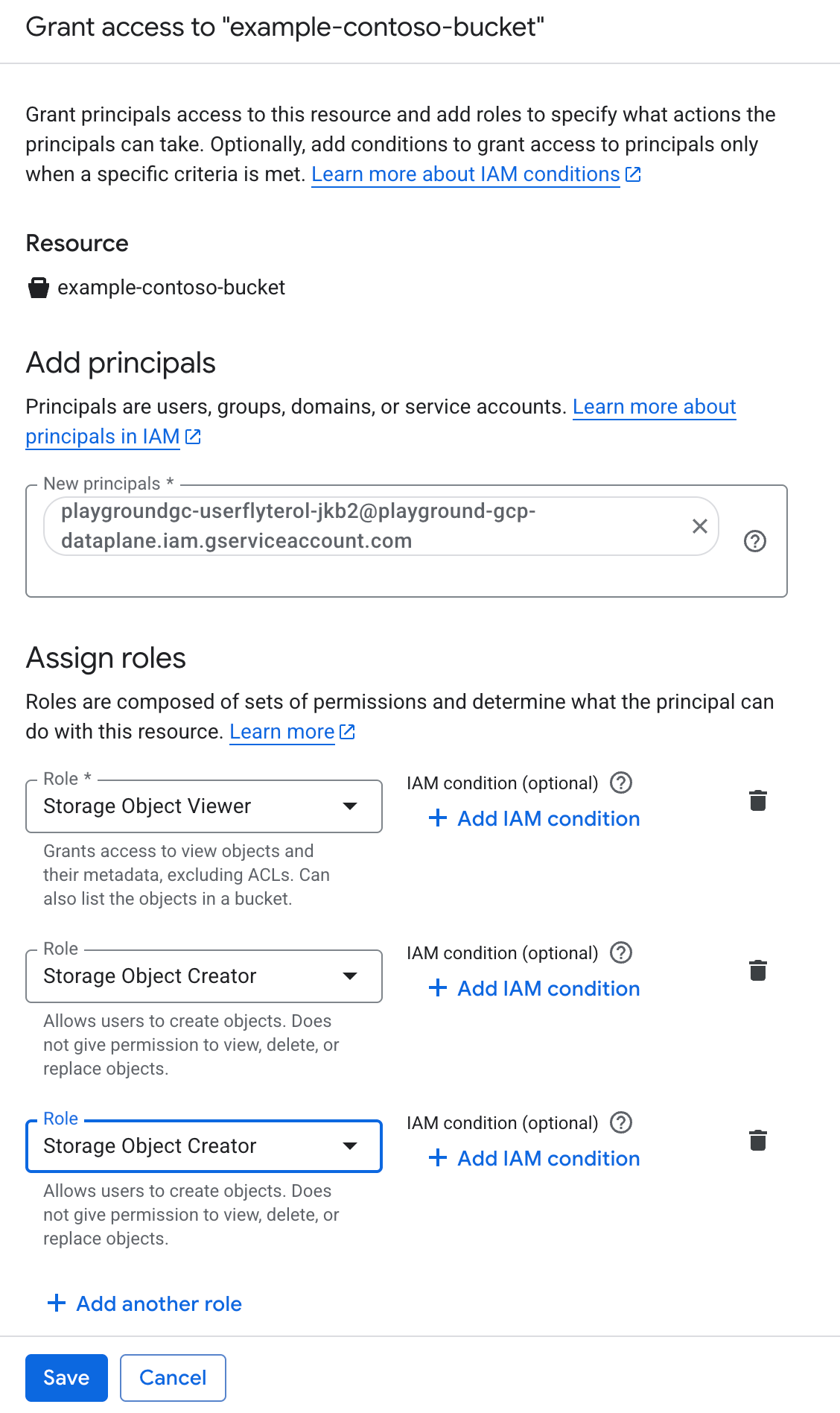 <UserFlyteGSA>into the New principals field. - Under Assign roles add as many roles as you need. In the example below we add the roles enabling reading and writing: Storage Object Viewer and Storage Object Creator.